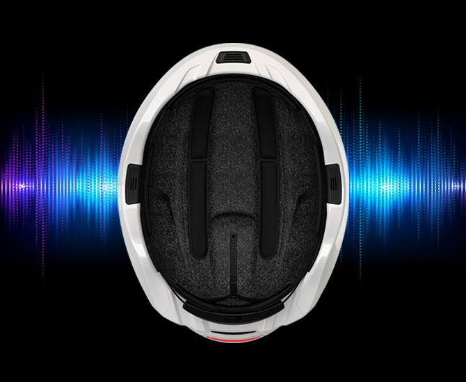 Audio is delivered through integrated speakers located above the rider’s ears, which allows for awareness of surrounding sounds such as traffic, unlike in-ear buds. The redesigned speakers have been optimized in order to keep the helmet as slim as possible for less wind resistance. Located in the front of the helmet is a built-in microphone that houses Sena's patented Advanced Noise Control™ technology, picking up and transmitting your voice clearly.