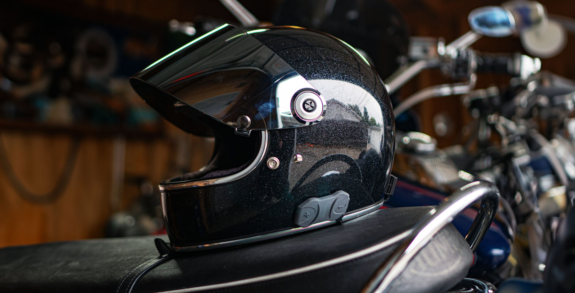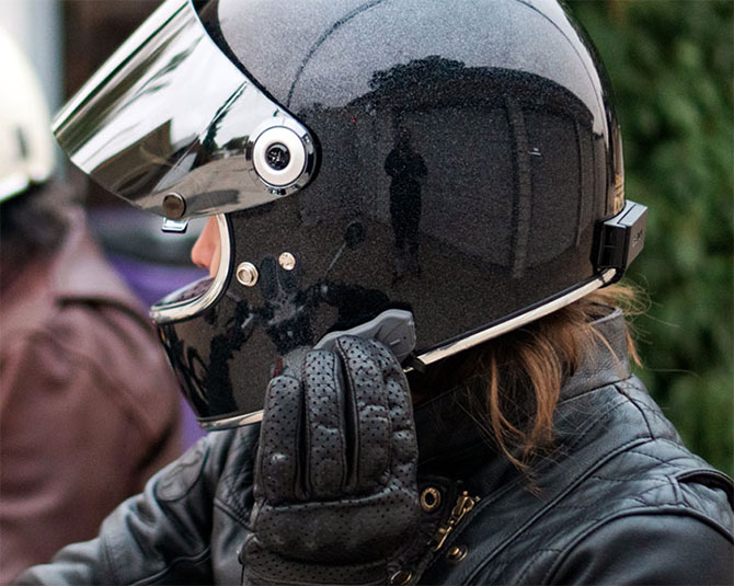Control the headset with a Sena remote control accessory.